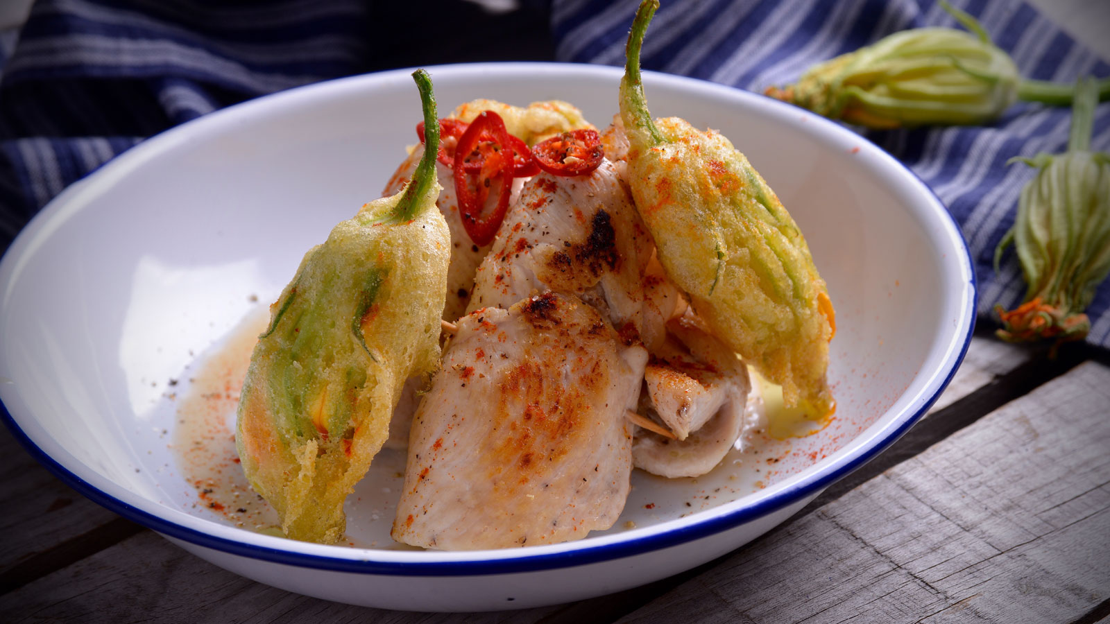 Por otra parte, mezclamos la cerveza con la harina. Pasamos la flor de calabacín por esta masa.