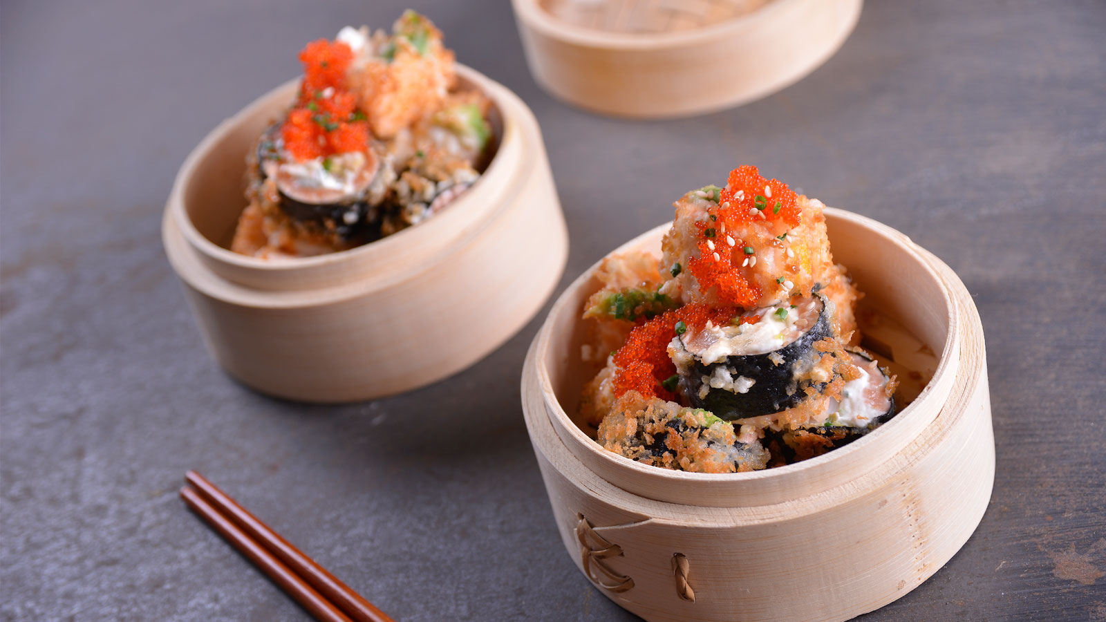 Cortamos cada rollito en tres y bañamos con la salsa. Decoramos con las semillas de sésamo, las huevas de tobiko y servimos.