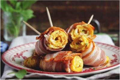 Rollitos de tortilla con mostaza, bacon y sal de pimentón