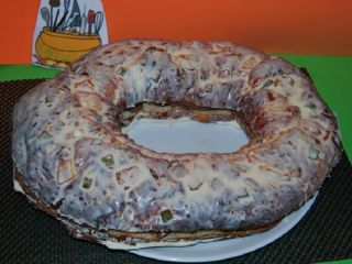 •Colócala bien en la bandeja, píntala con huevo batido, se colocan las frutas glaseadas y la almendra picada por encima, deja reposar de nuevo hasta que doble su volumen.