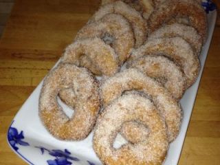 Poner las rosquillas sobre papel absorvente para quitar el exceso de aceite y despúes rebozar con la mezcla de azúcar y canela.