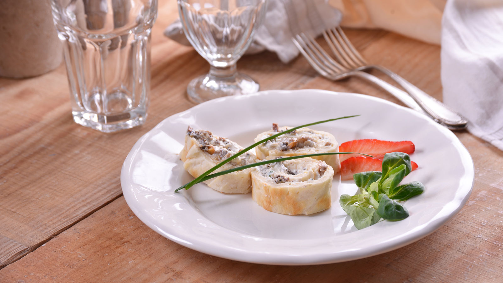 Emplatamos la roulada rellena en una fuente. Decoramos con una ramita de cebollino por encima y unas rodajas de fresa. Acompañamos con unos canónigos frescos.