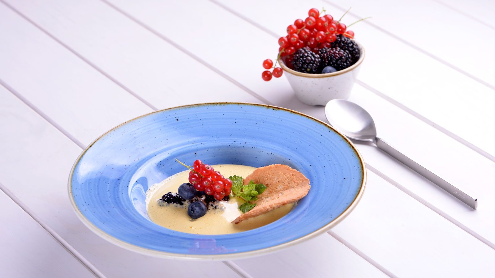 Servimos el sabayón en un plato hondo y cubrimos uno de los lados del plato con nuestras frutos del bosque y abundante menta fresca.