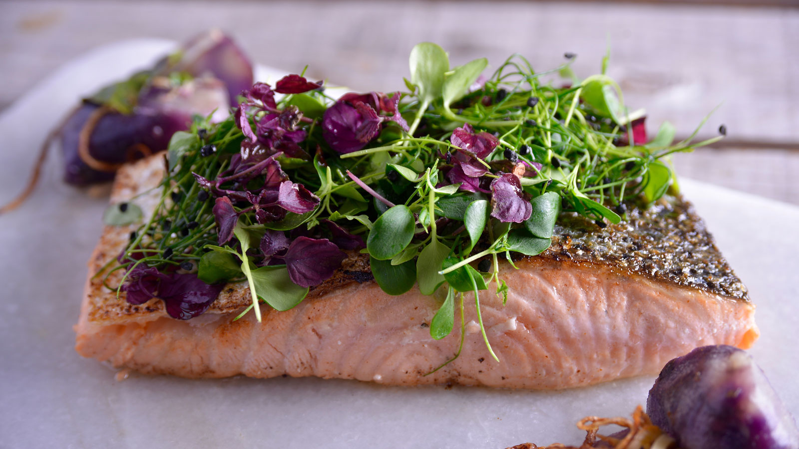 Salmón a la mantequilla recubierto de germinados con vinagreta de cítricos y miel de flores de romero
