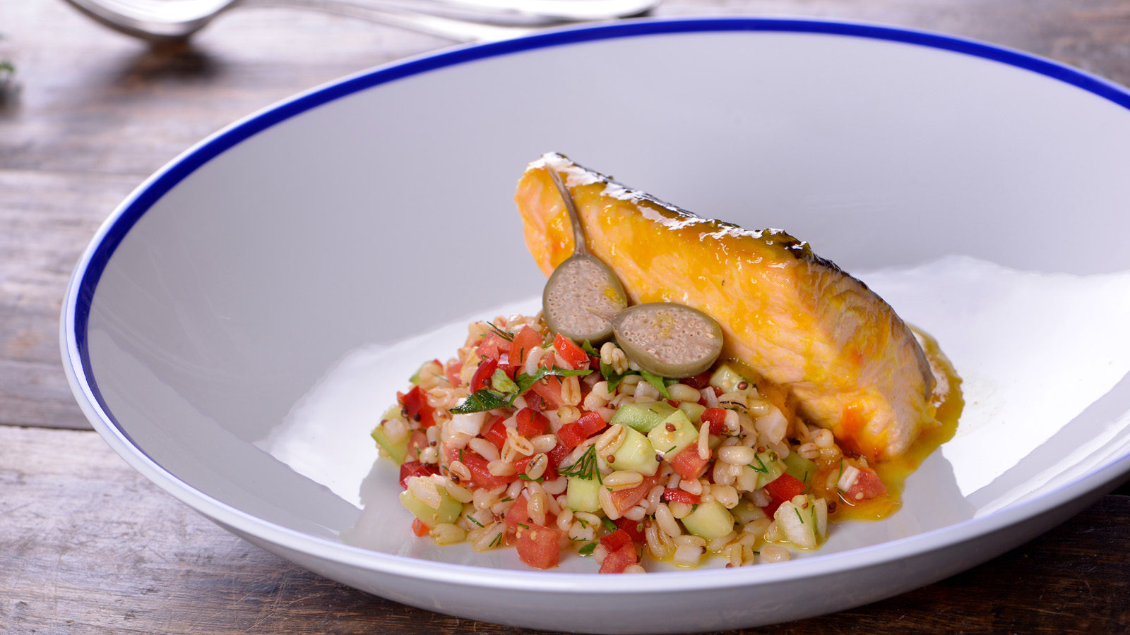 Salmón a la naranja con ensalada de trigo