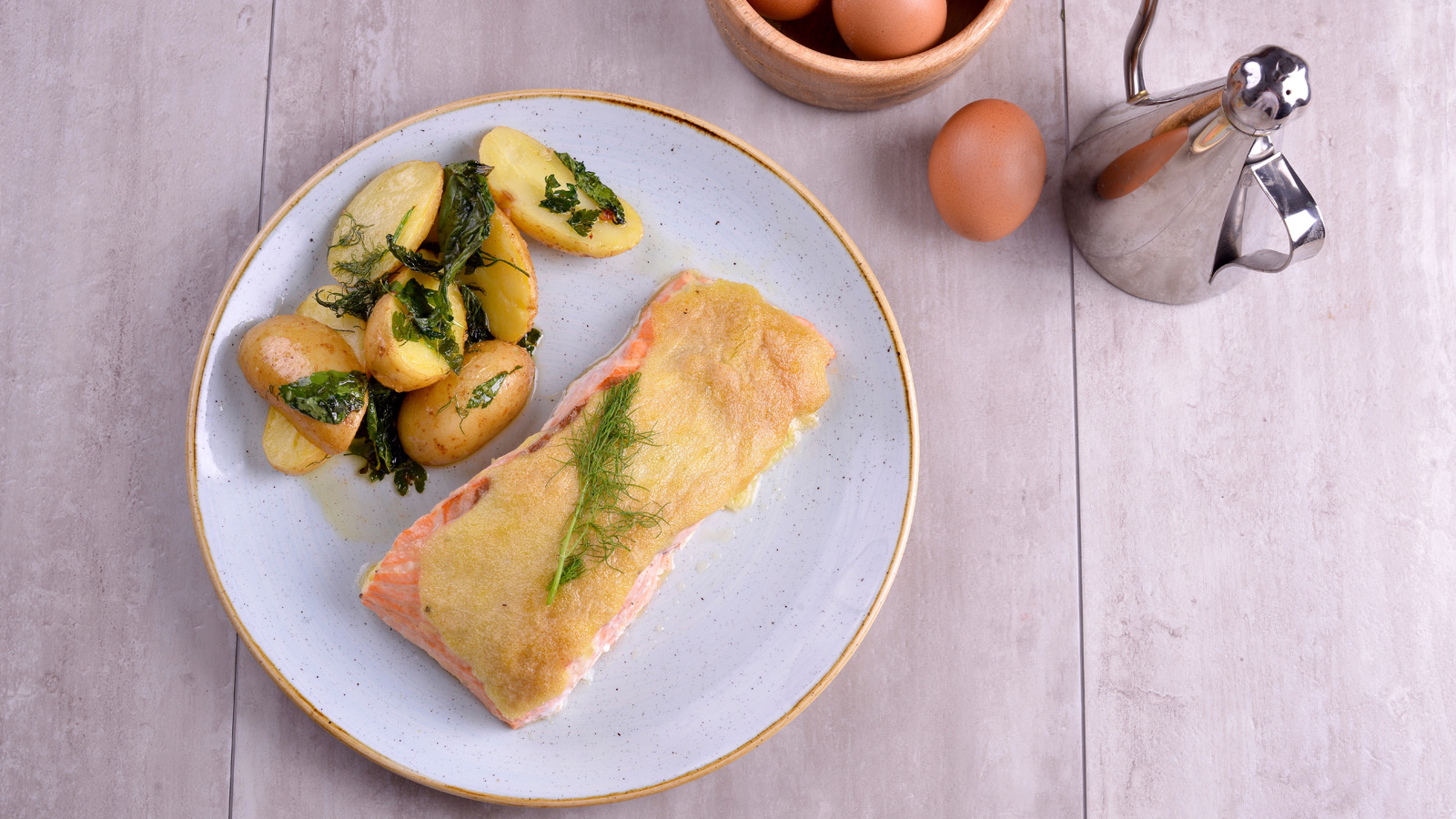 Salmón gratinado y patatas con vinagreta de hierbas y limón
