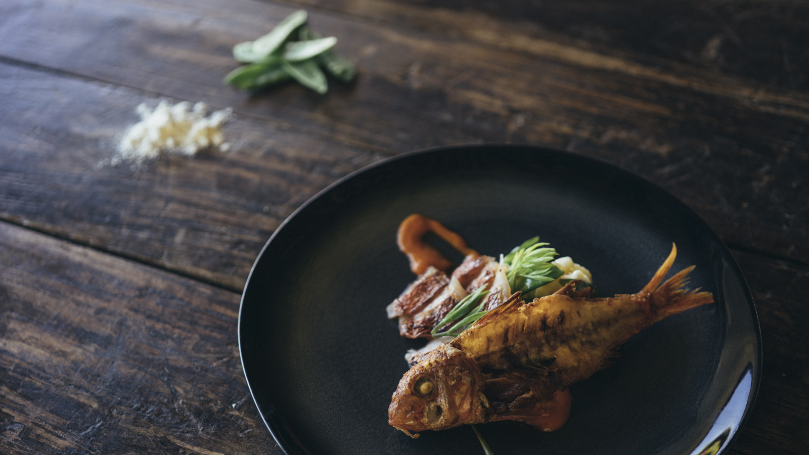 Servimos unas cucharadas de la menier de manteca, la ensalada de alubias, unas ramitas de hinojo marino, el salmonete fileteado y terminamos con la espina frita.