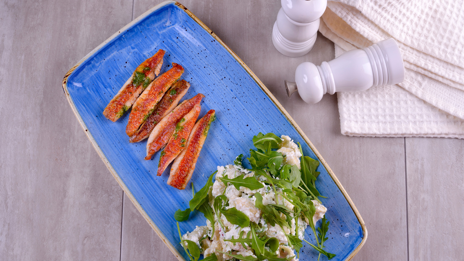 Salmonetes con ensalada de pasta cítrica