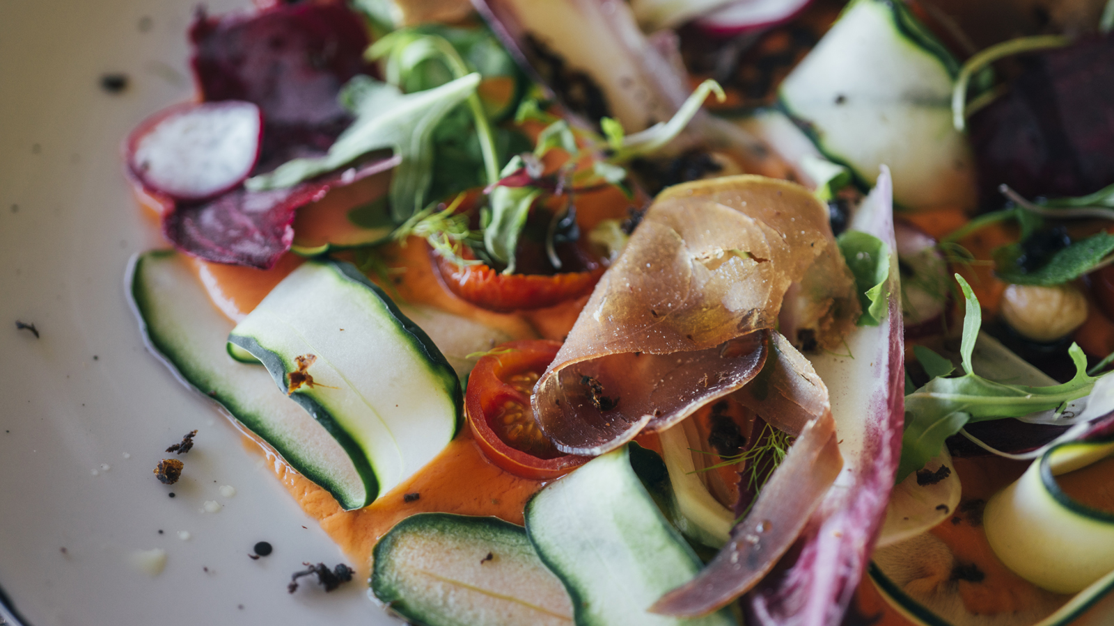 Servimos sobre un plato plano y ponemos por encima pepino, remolacha e hinojo en láminas.