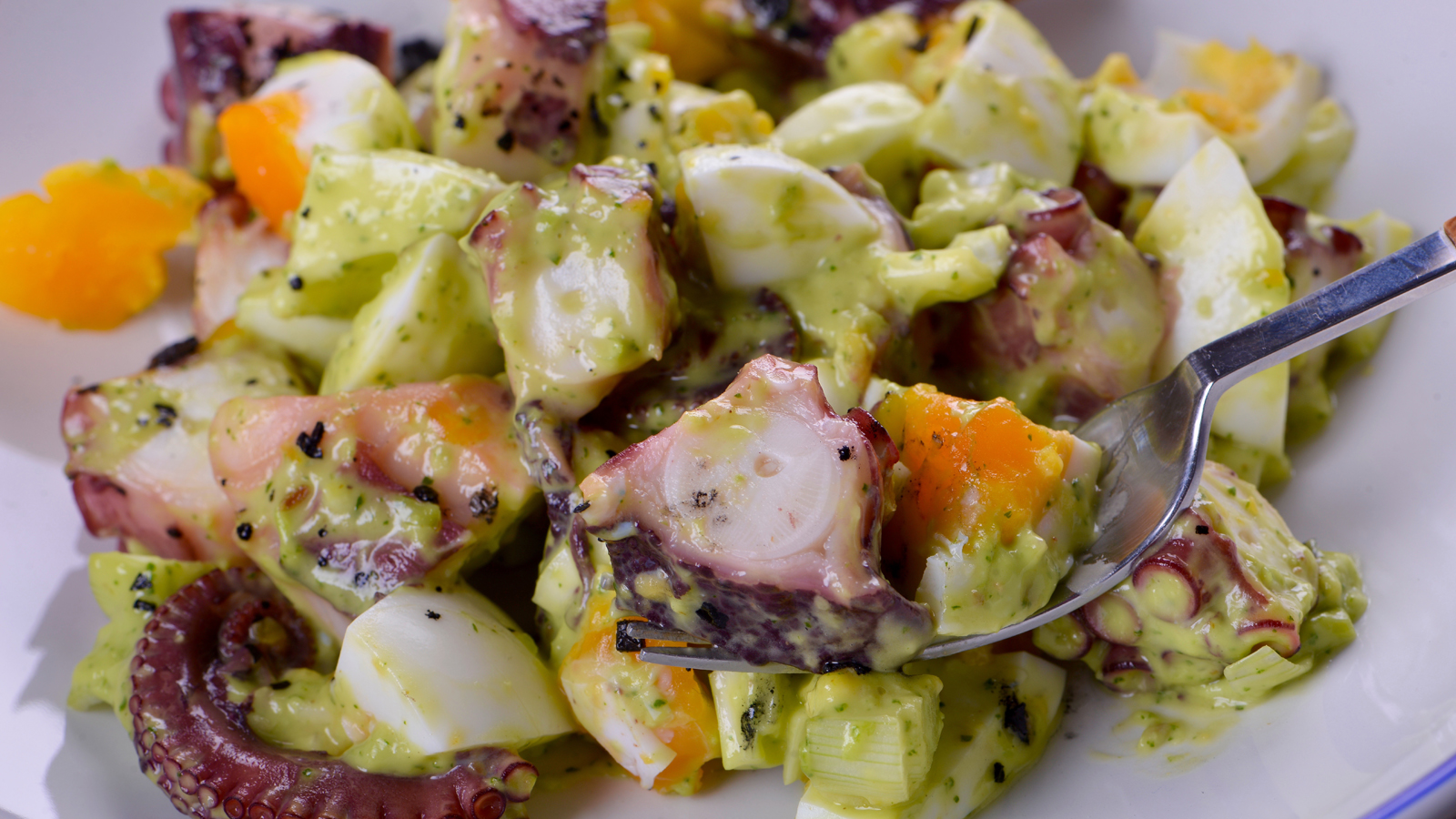 Picamos la cebolleta en brunoise, troceamos el huevo y lo mezclamos todo en un bol con el zumo de ½ lima, el pulpo y unas cucharadas del mojo.