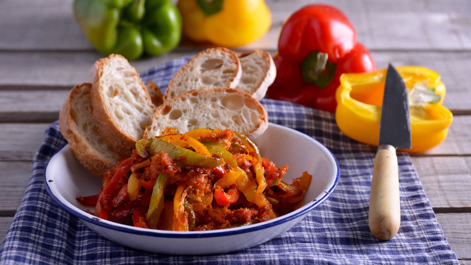 Salteado de pimientos tres colores mantecados con sobrasada y yema de huevo