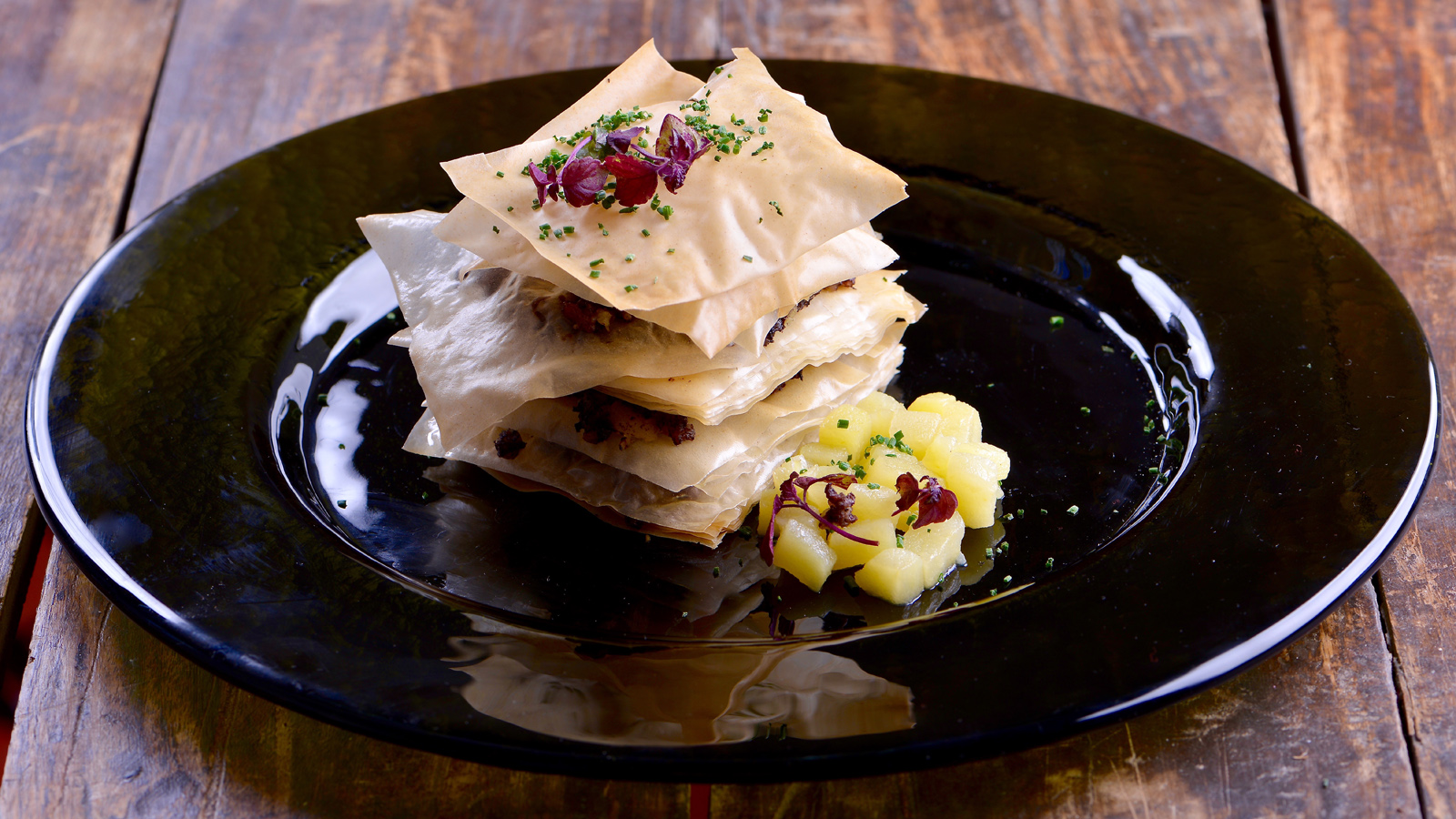 Sobre la pasta ponemos la mezcla de compota y morcilla, más láminas de pasta y acompañamos con unos dados de manzana, cebollino y brotes.