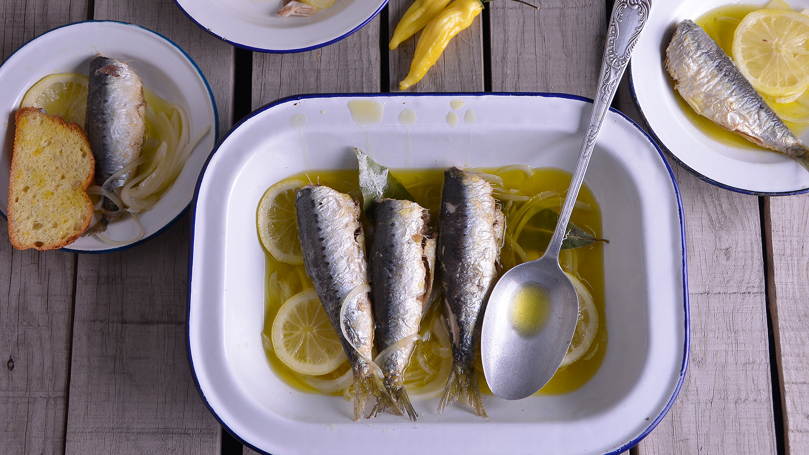 Ahora ponemos las sardinas en la cazuela en la que hemos preparado las verduras anteriormente y volcamos sobre ellas con cuidado el aceite de su cocción, todavía caliente.