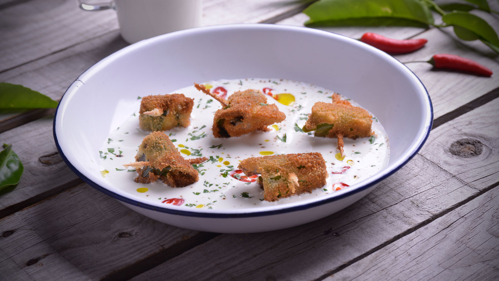 Para el emplatado, colocamos las sardinas en el centro del plato, vertemos alrededor la crema de burrata y coronamos con el chile y el perejil picado.