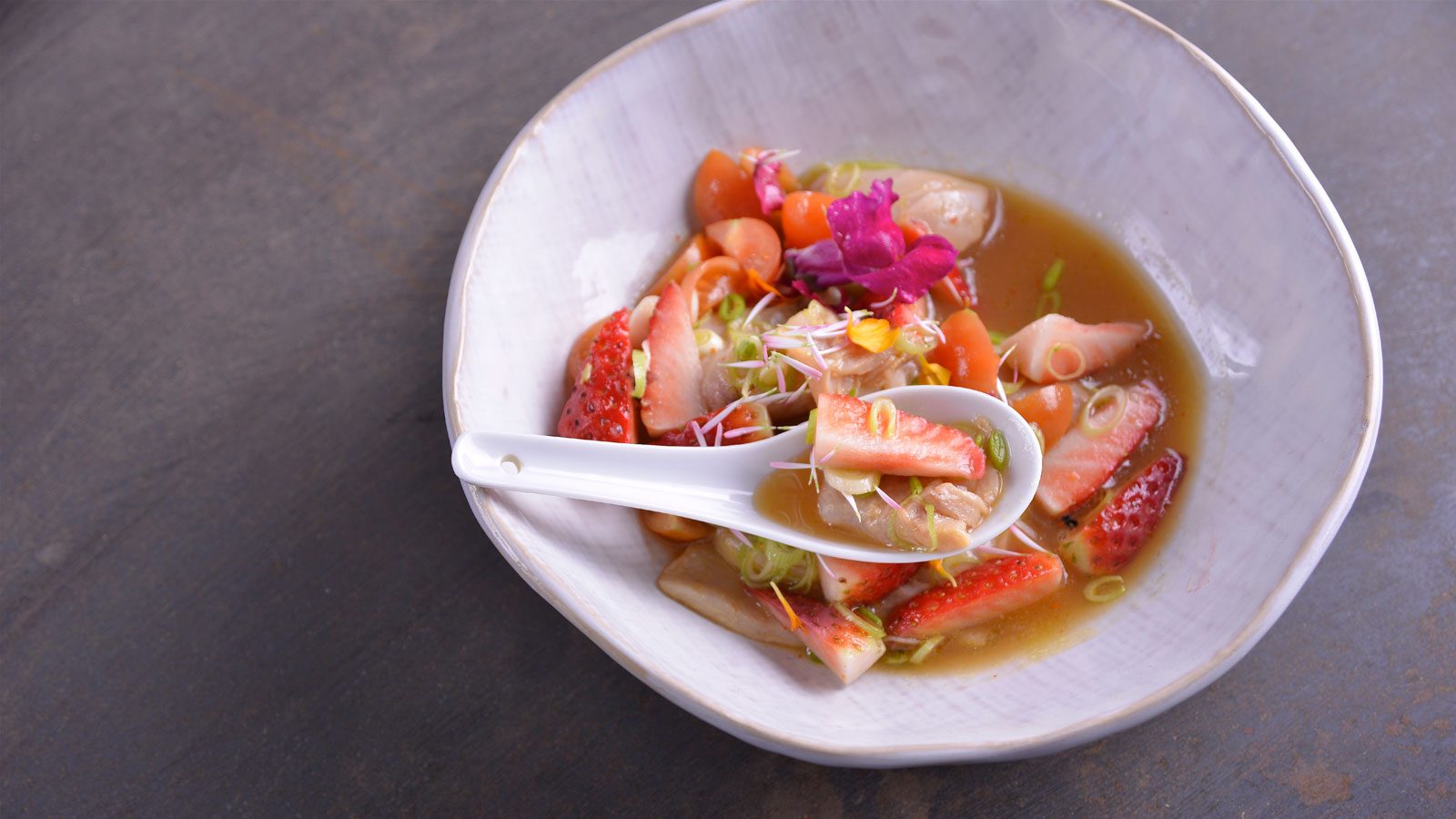 Decoramos con los pétalos de flores y la fresa cortada en láminas.