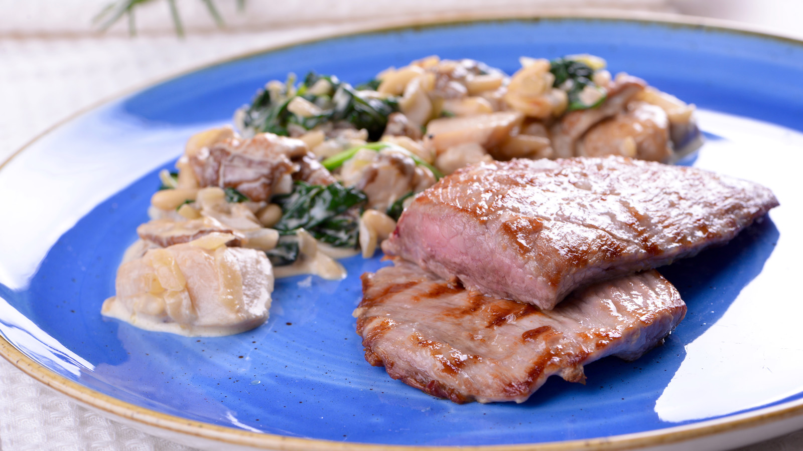 Secreto con espinacas y boletus