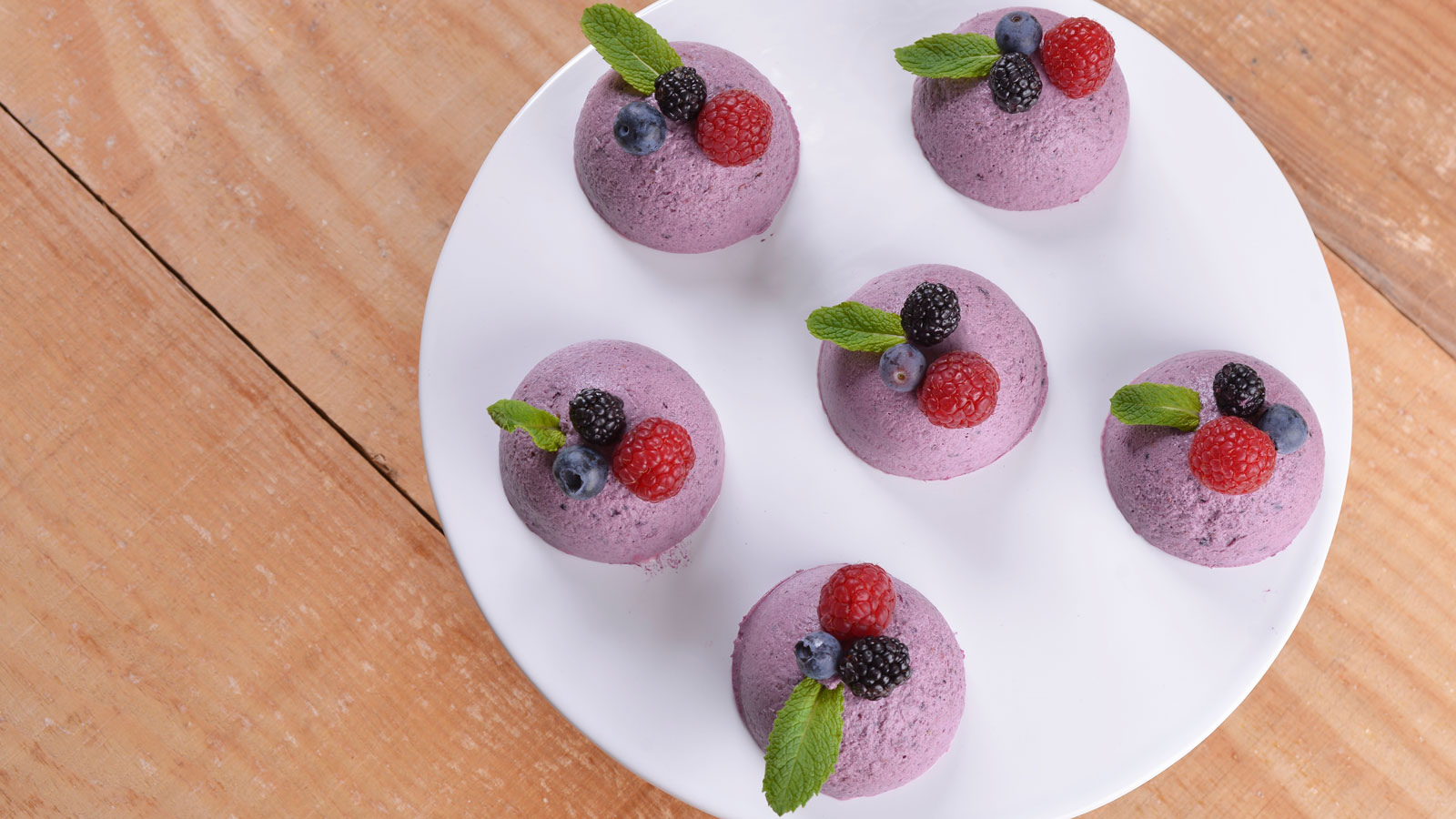 Emplatamos acompañado de la salsa de moras. Decoramos con unas moras, frambuesas y arándanos. Coronamos con unas hojas de menta fresca.