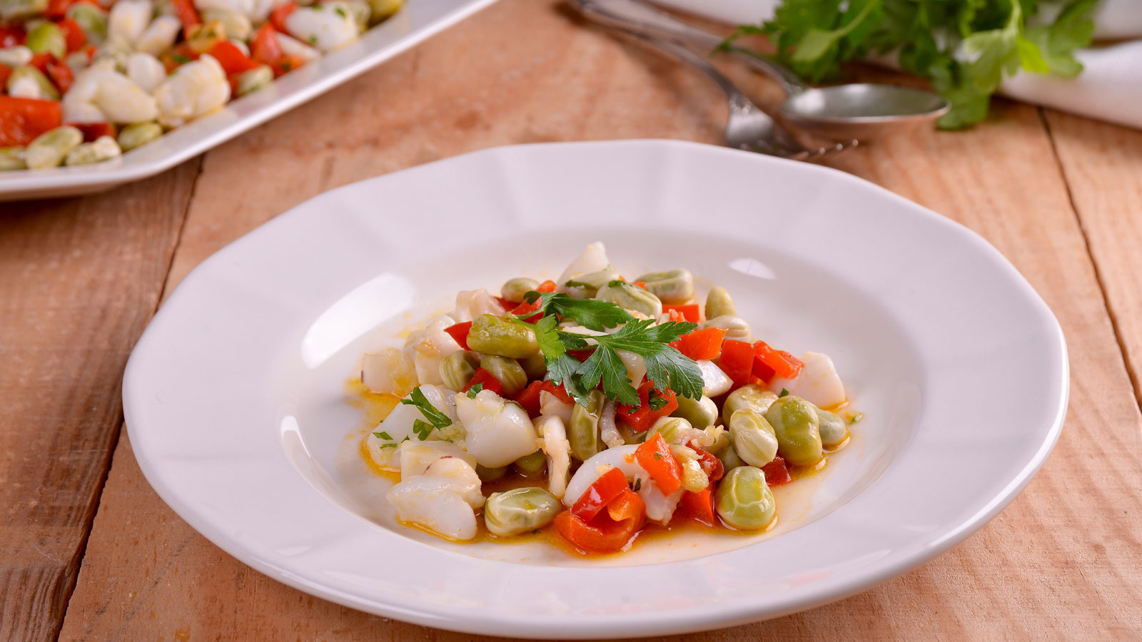Servimos nuestra sepia salteada con los pimientos y las habas.
