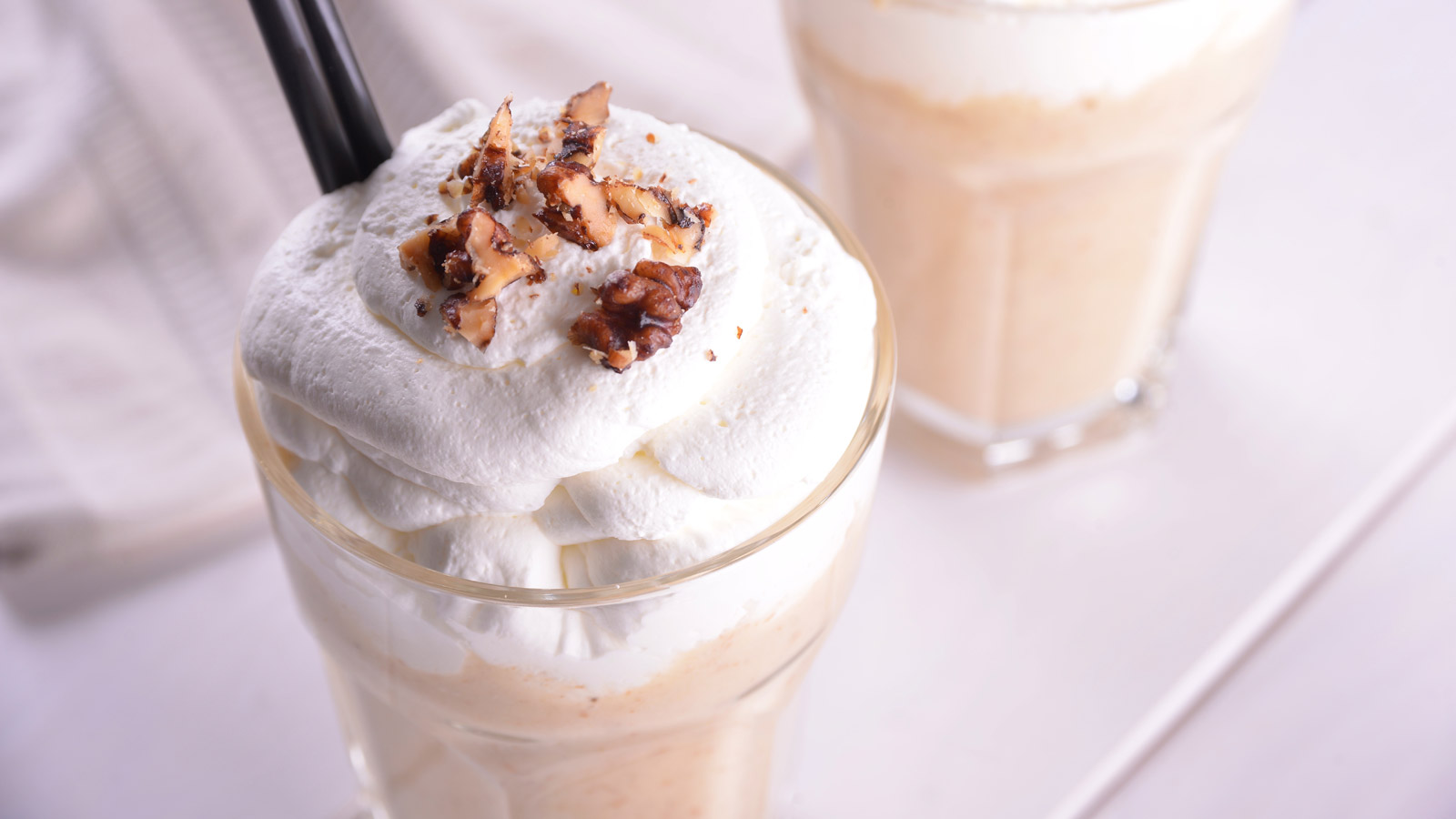 Servimos en vasos altos y decoramos con un copete de nata montada y un puñado de nueces caramelizadas.