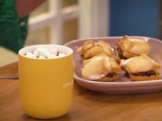 Extiende la hoja de masa de hojaldre sobre una superficie ligeramente enharinada. Con un cuchillo o cortapastas, corta 8 rectángulos iguales. Si quieres que tus s'mores tengan forma de empanadilla, también puedes cortar 8 círculos. Marca con el tenedor la masa de hojaldre en el centro. Coloca los rectángulos en la cesta de la airfryer, dejando espacio entre ellos para que el hojaldre suba bien. Cocina a 180ºC durante 7-9 minutos, hasta que estén dorados y crujientes. Pasado ese tiempo, ábrelos con un cuchillo de sierra por la mitad. Coloca una onza de chocolate, pon la tapa y coloca un malvavisco en la parte superior. Coloca los s'mores en la cesta de la airfryer y cocina a 180ºC durante 3 minutos, hasta que estén dorados. Deja templar 2 minutos. Preparamos una bebida de chocolate para acompañar. En un cazo calienta la leche, la nata y la canela. Cuando rompa a hervir, añade el chocolate y disuelve bien fuera del fuego. Sirve acompañado de los s'mores.