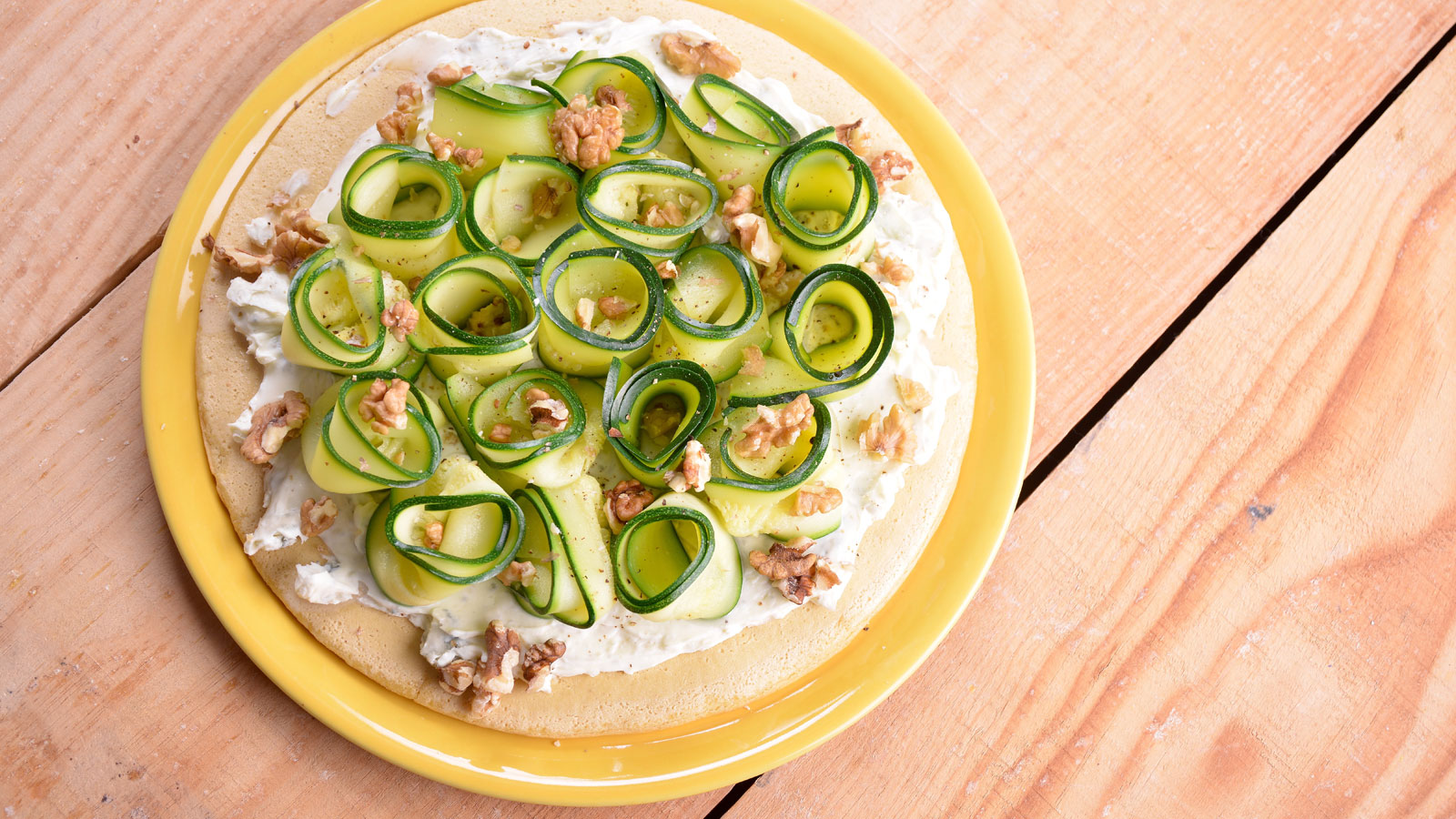En una fuente amplia untamos las soccas con la crema de queso y añadimos unos rulos de calabacín por encima. Decoramos espolvoreando unas cuantas nueces troceadas sobre las soccas.