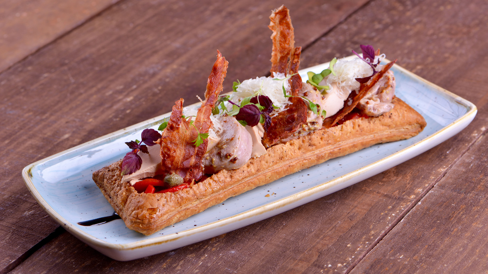 Colocamos sobre el hojaldre los pimientos, los medallones de solomillo, el micuit en rodajas, las lonchas de beicon y una nube de queso rallado.