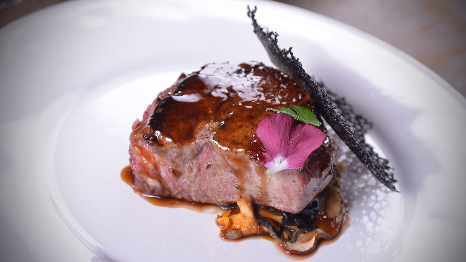 Emplatamos nuestros medallones de la siguiente manera: Colocamos un medallón de carne y la coronamos con unas pocas setas por encima. Continuamos con el crujiente apoyado en el medallón y terminamos napando con la salsa de carne.