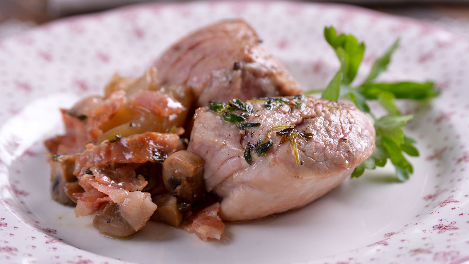 Solomillo de cerdo con champiñones y cebollitas