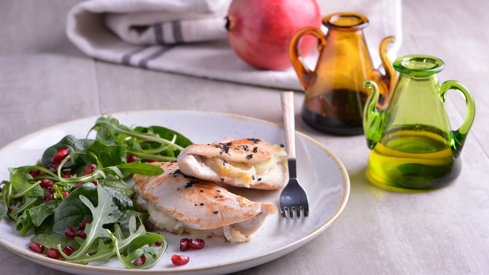 Solomillo de pavo con queso de cabra y ensalada verde