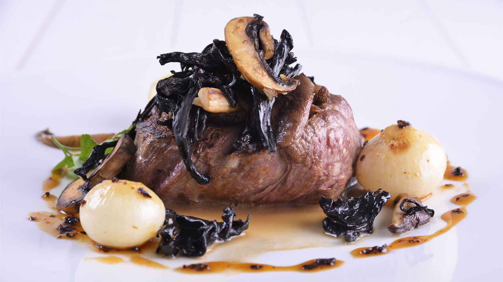 Emplatamos el solomillo, encima las setas y las cebollitas.