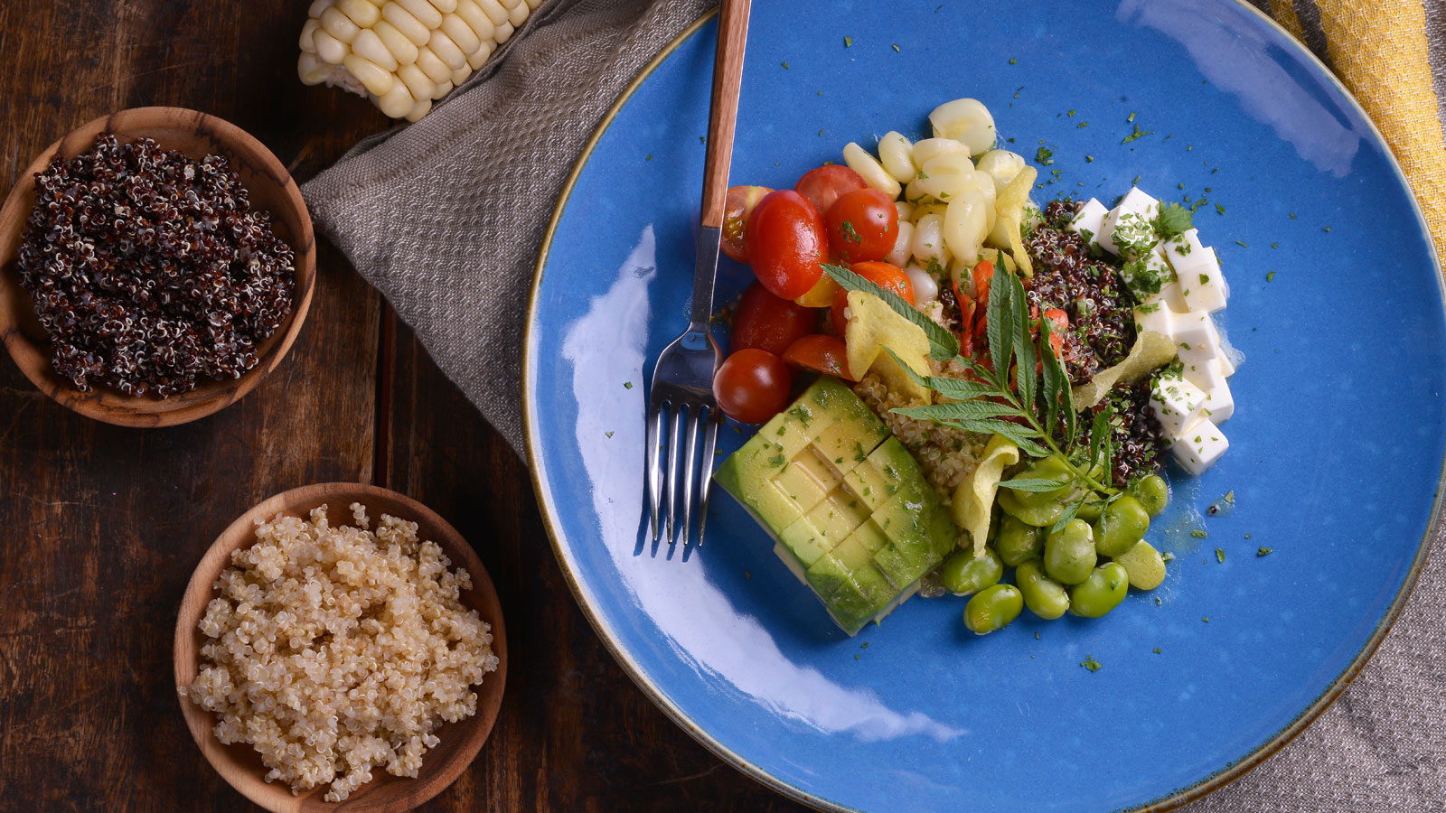 Primero echamos un poco de quinoa blanca y de quinoa negra en un plato grande, un poquito de maíz choclo cocido, las habas, una cucharada de queso fresco y medio aguacate en dados. Por último, tomates cherry cortados por la mitad.