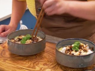 Picamos el tofu y las setas en dados. Lo colocamos en la cesta de airfryer y ponemos un poco de aceite. Cocinamos a 200ºC durante 10-12 minutos. Mientras se asan el tofu y las setas, calienta el caldo vegetal y remoja los fideos en agua caliente o lo que indique el fabricante. Calienta 1–2 cucharadas de aceite en un pequeño cazo hasta que empiece a humear ligeramente. Mientras tanto, en el plato de emplatar ponemos ajo rallado, jengibre rallado, crema de cacahuetes, chile y cebolleta picados. Una vez el aceite esté caliente, vierta con cuidado un poco de aceite sobre los ingredientes para que suban los aromas. Agregamos los fideos remojados al plato, las setas y el tofu cocinados y cubrimos con caldo. Terminamos regando con un poco de salsa de soja y leche de coco.
