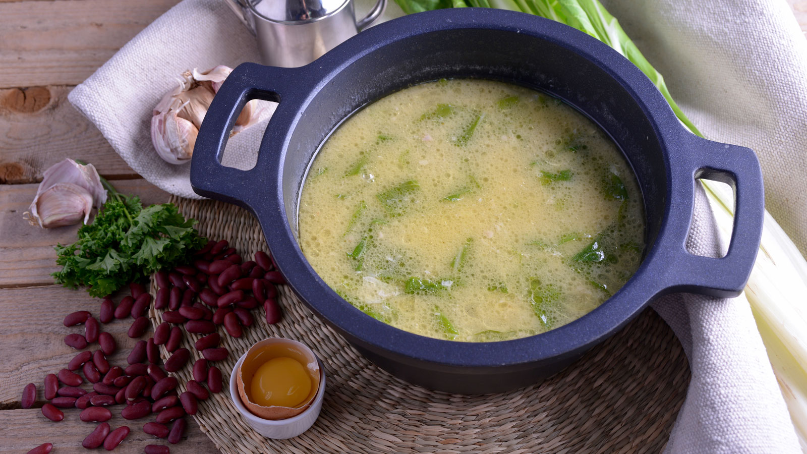 Sopa de ave con huevo y alubia roja