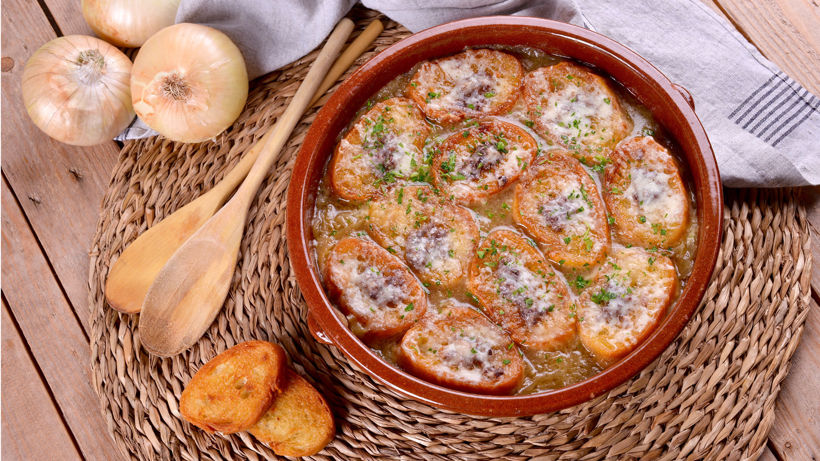 Sopa de cebolla gratinada con queso manchego