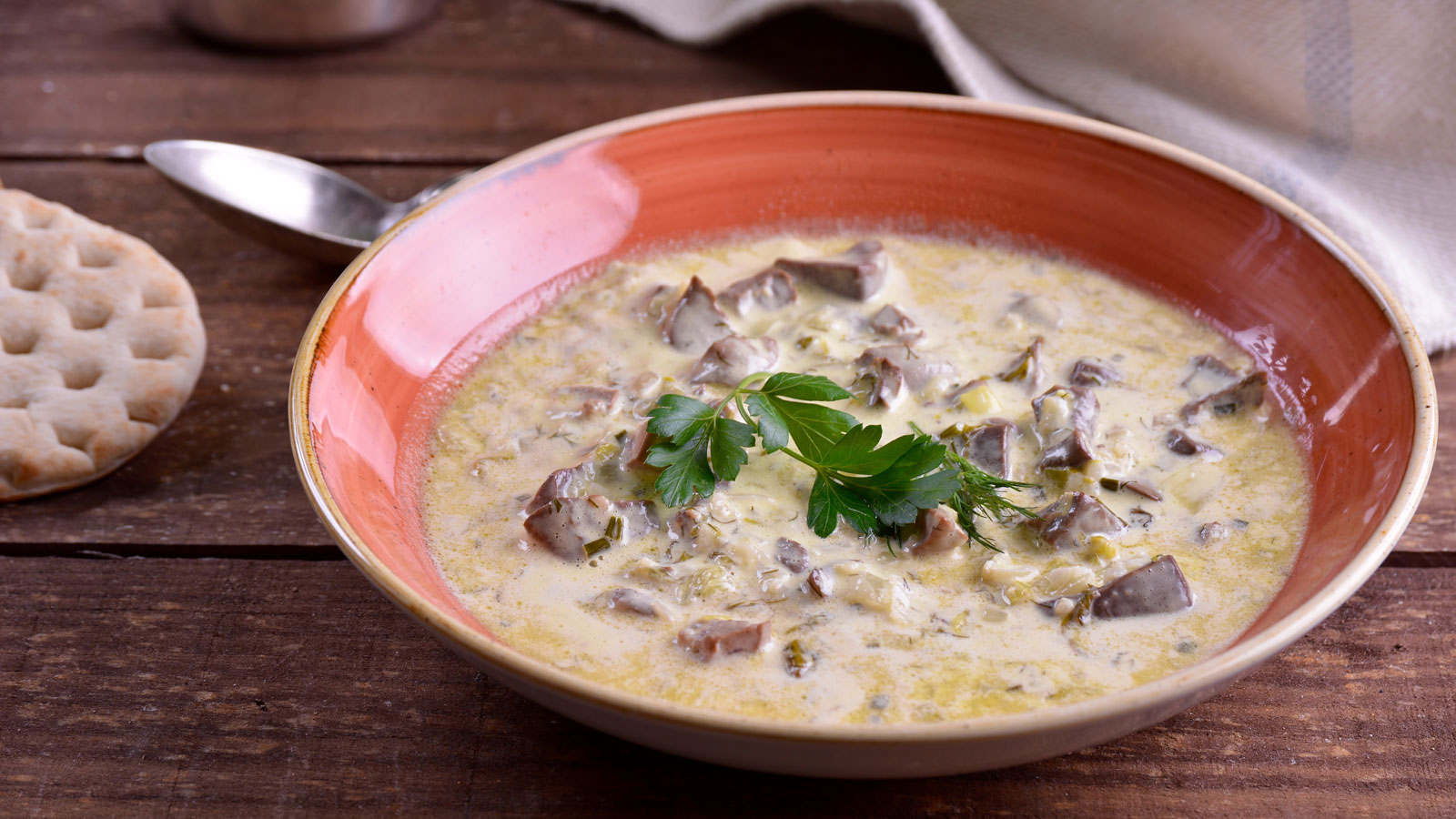 Emplatamos nuestra Sopa de cordero y servimos bien caliente decorando con 1 ramita de perejil fresco.