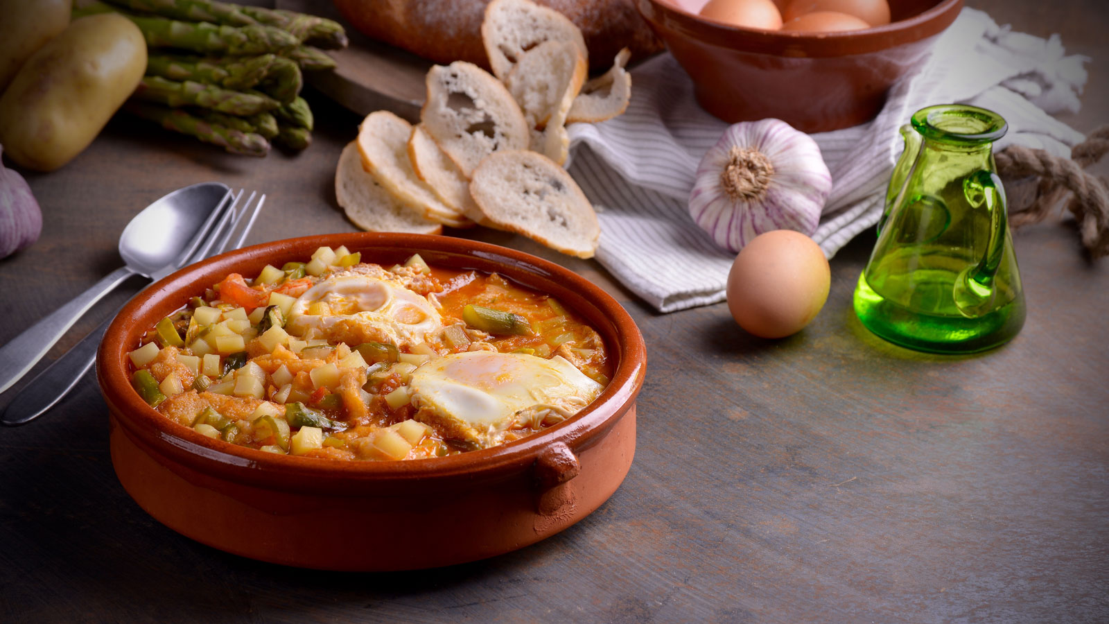 Cubrimos los ingredientes con caldo de verdura. Dejamos que rehogue a fuego medio y cuando la verdura esté cocida, añadimos 4 huevos y pan del día anterior. Dejamos que los huevos que se hagan al calor de nuestra sopa.