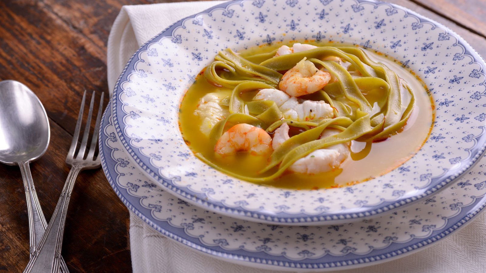 En el capítulo 6 del programa La abuela Lolita la cocinera Dolores Valcárcel nos ensaña a preparar una receta de Sopa de pescado con cintas de pasta y langostinos.