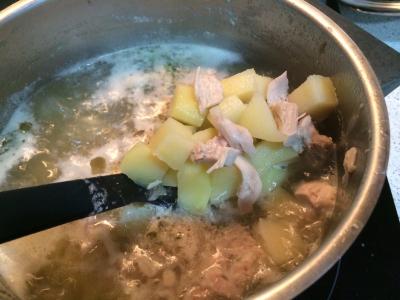 Agregar las patatas cortadas en cubos y esperar a que se cocinen a fuego medio/alto por unos 15 minutos. Hay que probar y mirar si la patata está hecha.