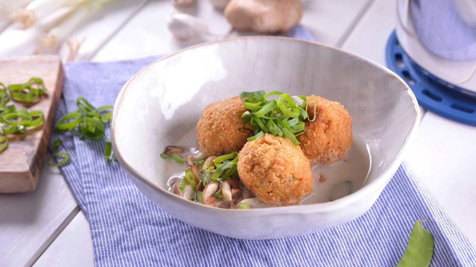 Para rebozar nuestras albóndigas, batimos un huevo en un plato hondo. Mezclamos en otro plato hondo el pan rallado y el coco rallado a partes iguales. Pasamos las albóndigas por huevo y después por la mezcla de pan rallado y coco.