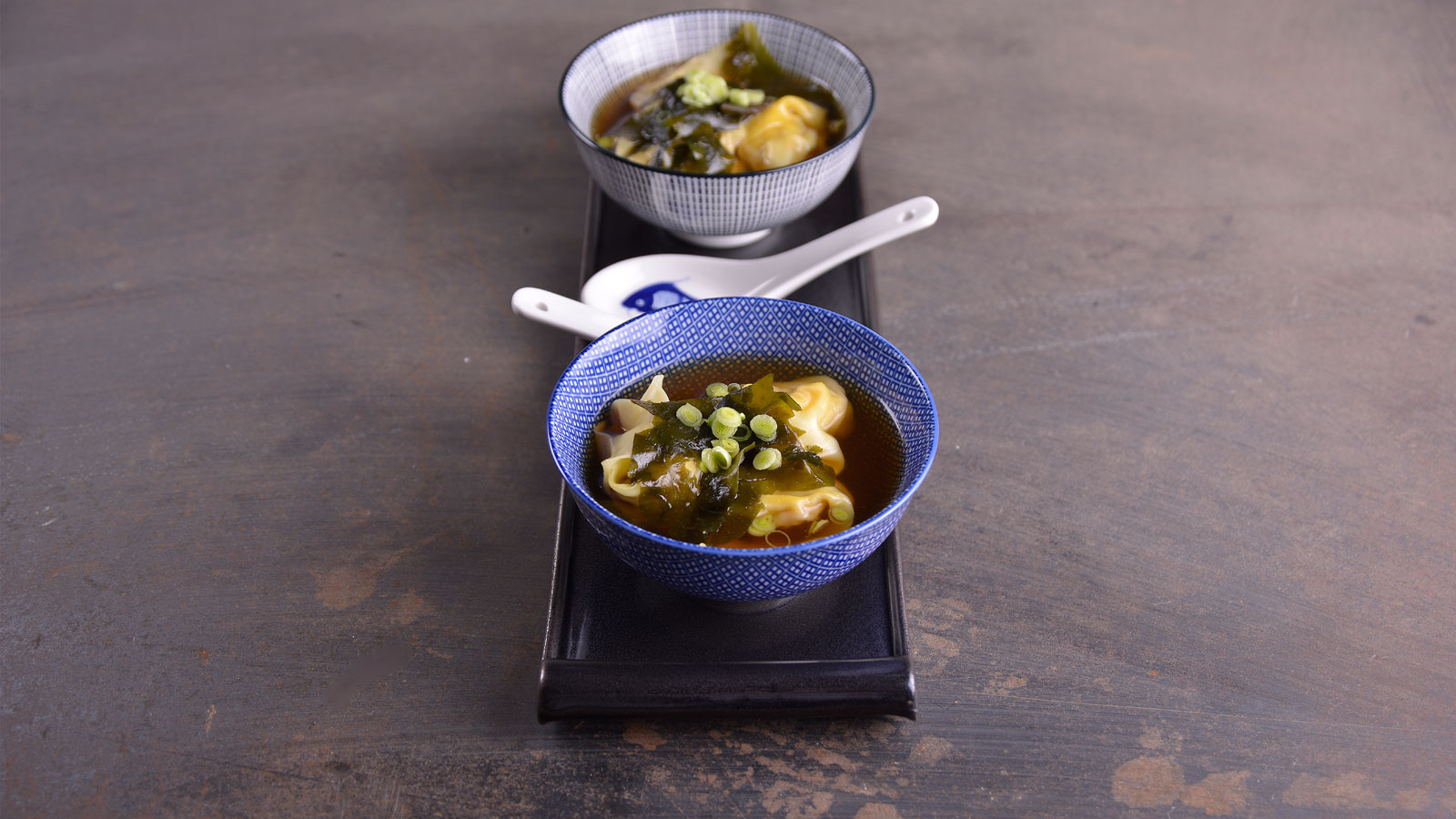 Servimos un cuenco de sopa de pollo caliente con algas, añadimos el wantun escurrido y servimos.