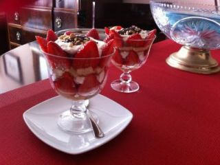 Cortamos los fresones a la mitad y los colocamos encima de los sobaos con el corte hacia el cristal y de manera que nos queden de pie.Ponemos unas cucharadas de la nata que teníamos montada, empujandola hacia el borde de la copa para que se meta entre las fresas.Desmenuzamos las galletas maría y ponemos unos trocitos por encima de la nata y unos fideos de chocolate y hacemos otra capa igual.Reservar en la nevera hasta el momento de servir.