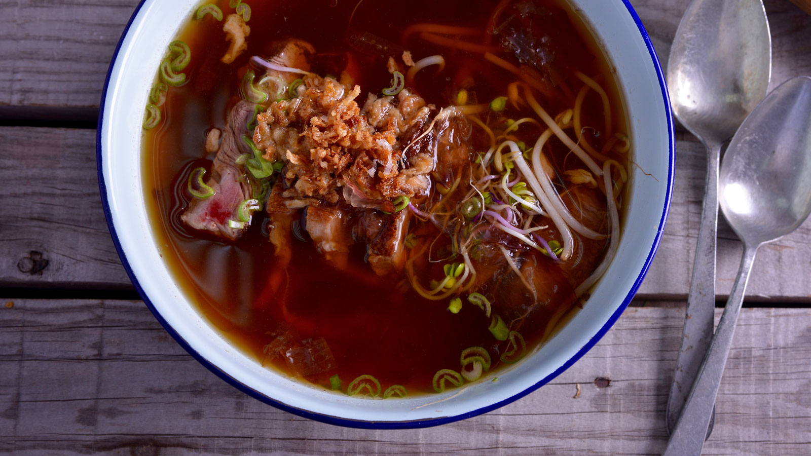Pasado ese tiempo, incluimos los fideos y el caldo en un bol hondo y coronamos con la cebolleta verde y la deshidratada, los brotes de soja y alubias y la carne.