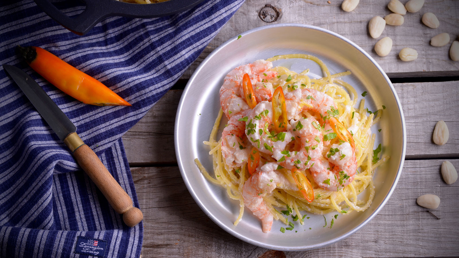 Spaghetti a la almendra con gambas al limón