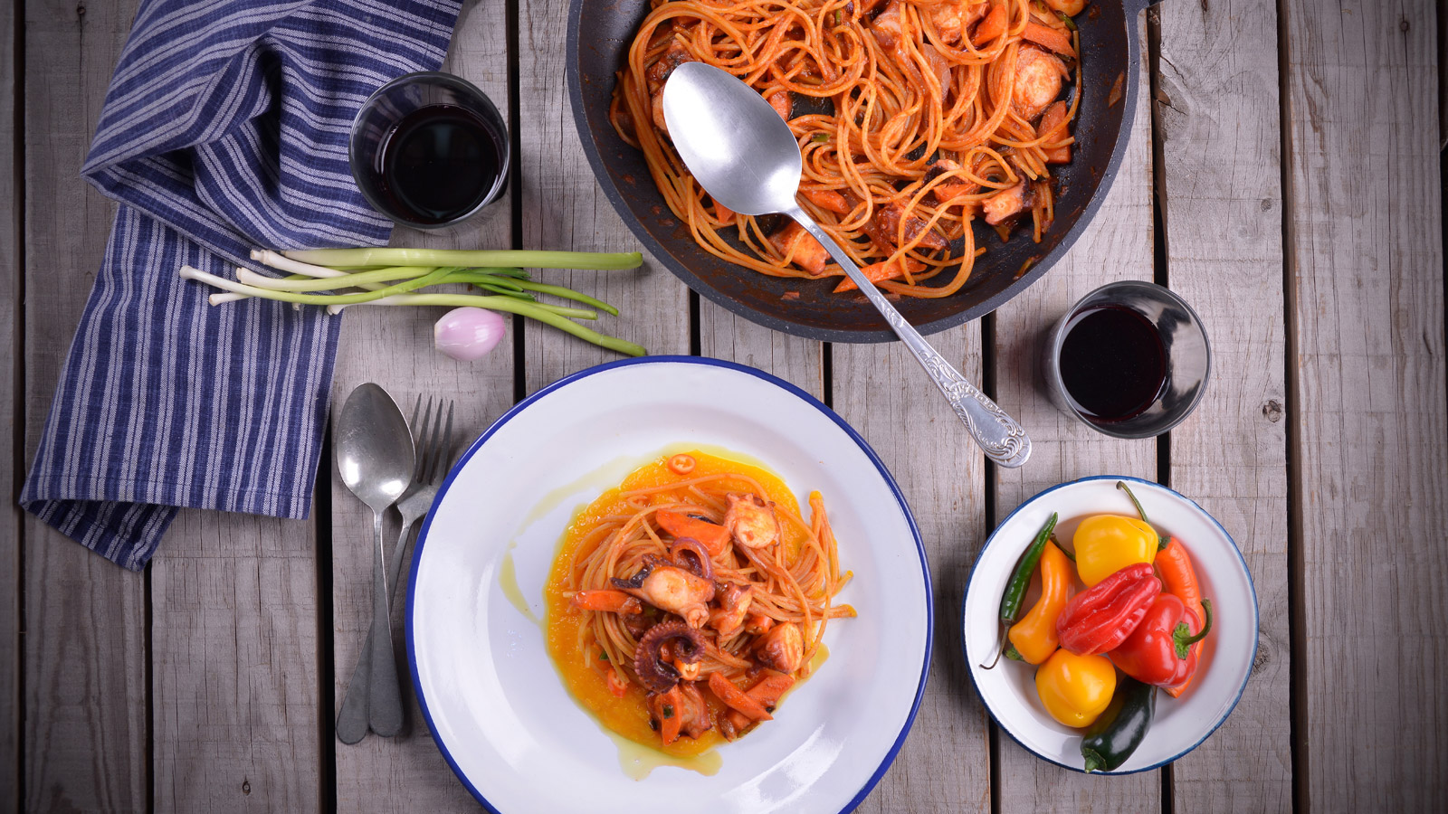 En el capítulo 160 del programa de televisión La cocina de Nicola T8, el cocinero Nicola Poltronieri prepara una receta de Spaghetti con ragú de pulpo. Los espaguetis son un tipo de pasta con forma de cuerdas largas y delgadas típicas de la gastronomía italiana, aunque también son habituales en la cocina del resto del mundo. Según su diámetro se distinguen en spaghettini (nº3),