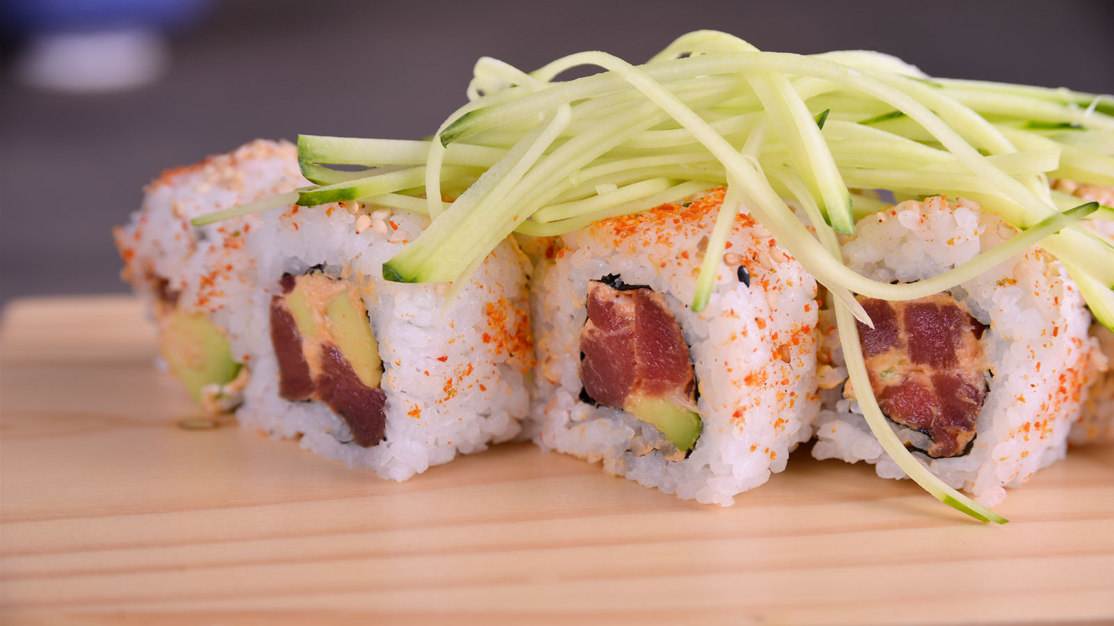 Cortamos en 8 el uramaki y encima colocamos el pepino cortado en juliana fina. Servimos acompañando con el jengibre y el wasabi. También acompañamos con un cuenco de salsa de soja.