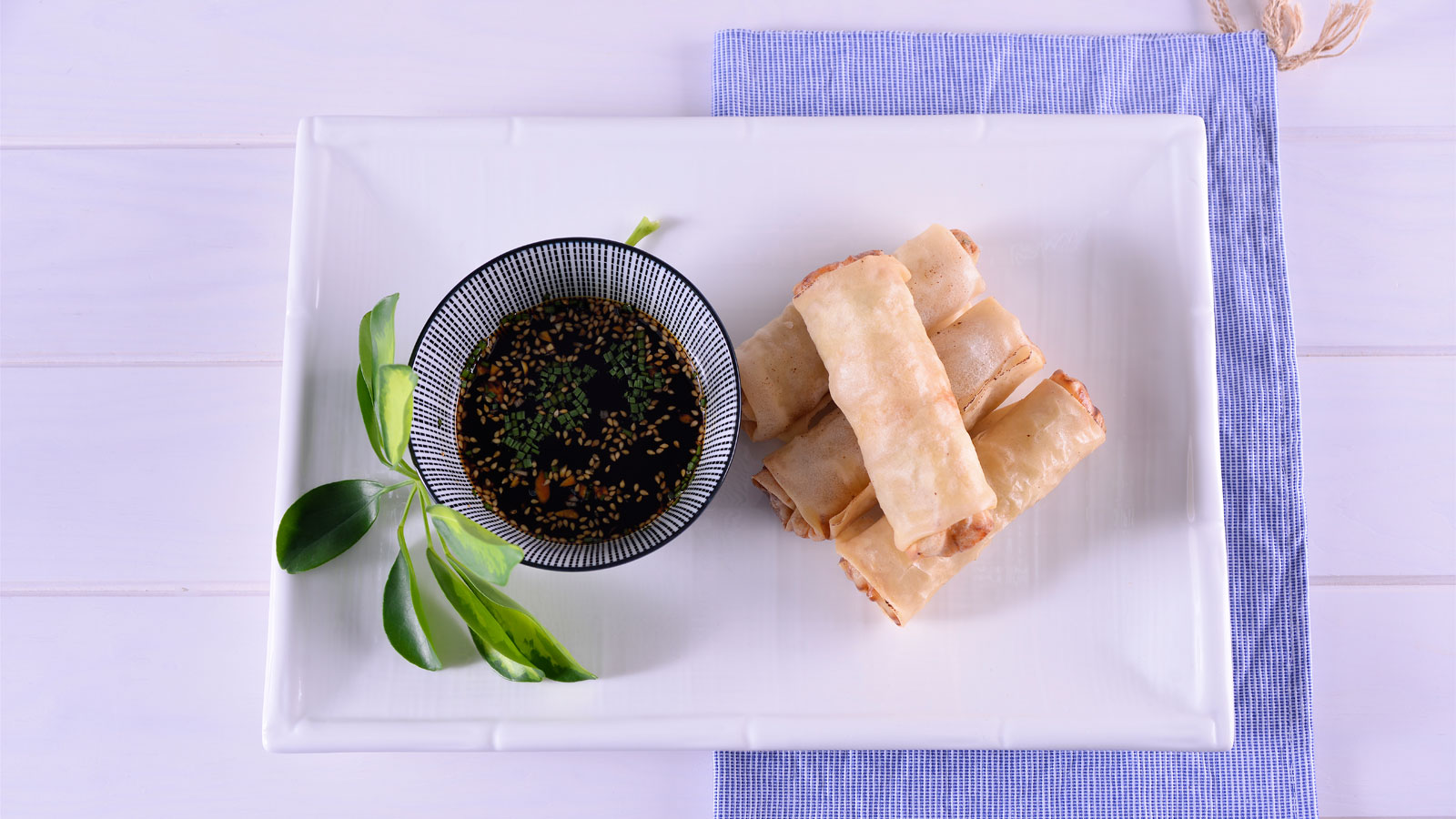 Emplatamos y servimos los rollitos con salsa de soja y cebollino picado.