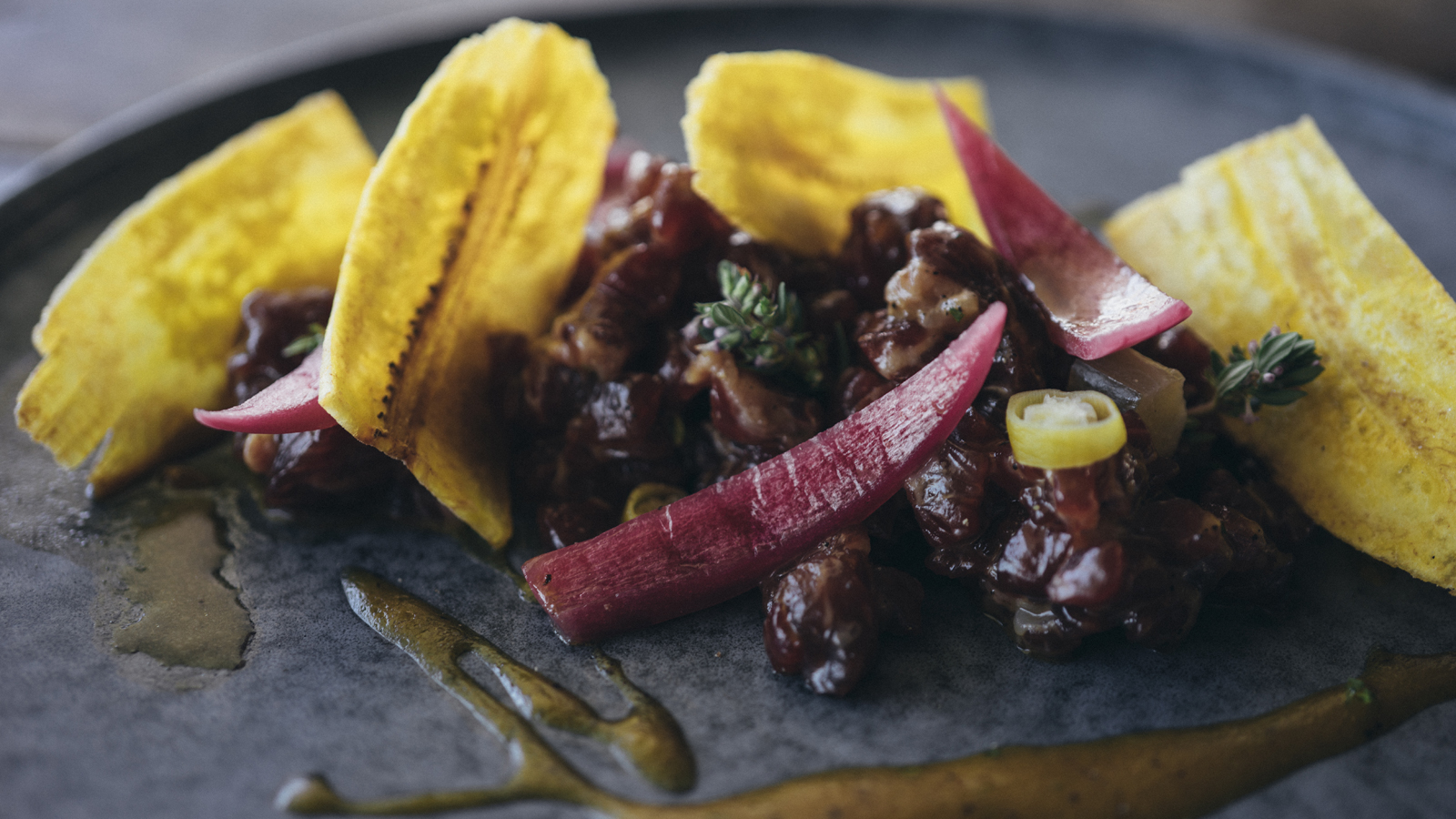 Terminamos con un poco más de la emulsión, los jugos de la grasa de la carne y unos chips de plátano macho.