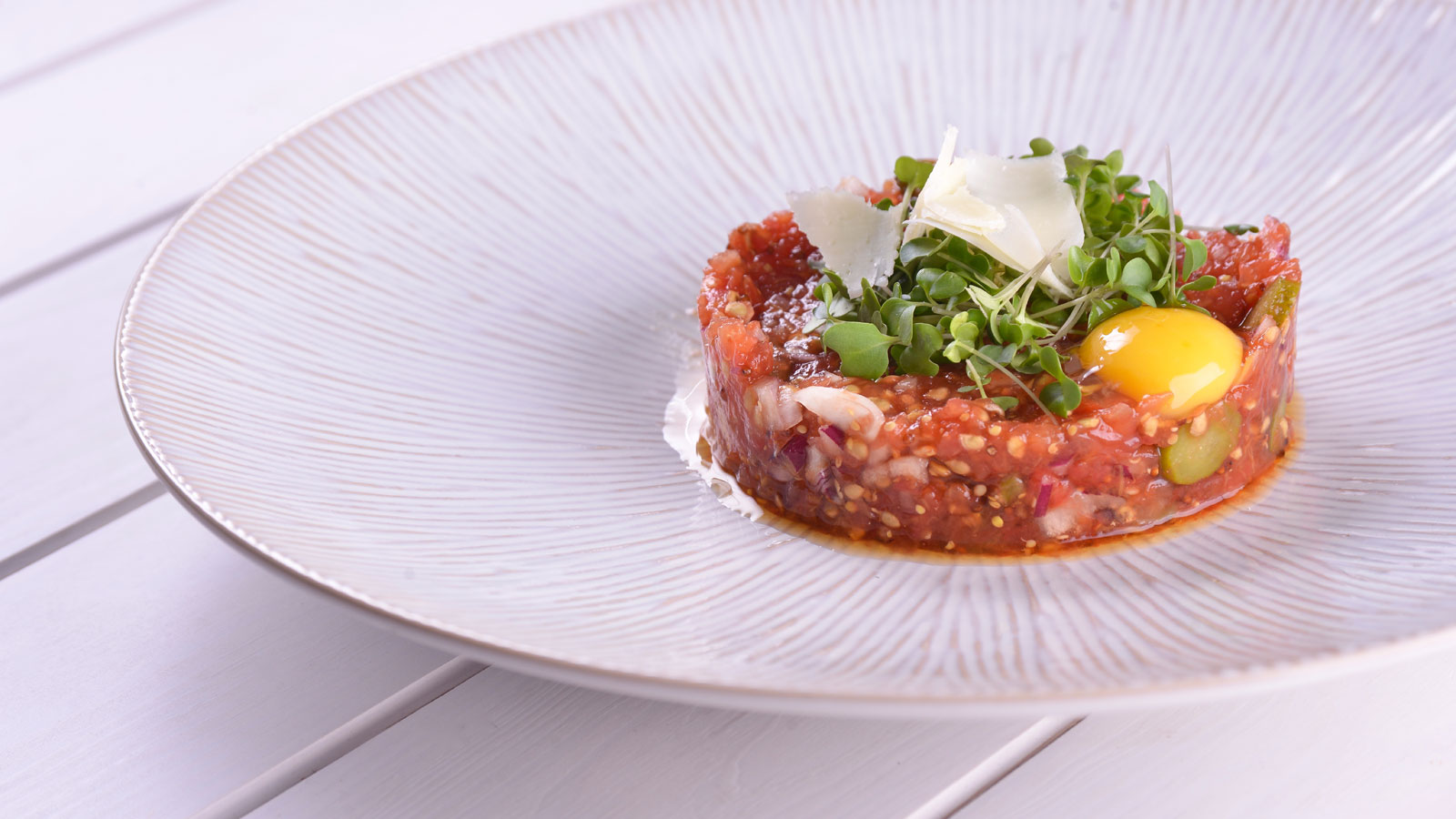 Emplatamos con ayuda de un aro el tartar y le ponemos una yema por encima.