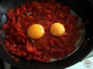 Según la cantidad del tomatito bien pochado tienes que escoger la respectiva cantidad de huevos grandes y, si es posible, del pueblo y del coral, sus yemas te compensarán por el sabor, su tamaño hermoso y por su color naranja tan intenso. Un caprichito, mientras, te voy a contar. La receta manda que los huevos se tienen que batir para mezclarse bien con la salsa recién elaborada. Yo siempre procedo así pero dejo un huevo a parte integro, sin curtir y con azotes castigar; te acordarás de mi cuando al final en esa yema sin batir tu trozo de pan remojes y rebañes.