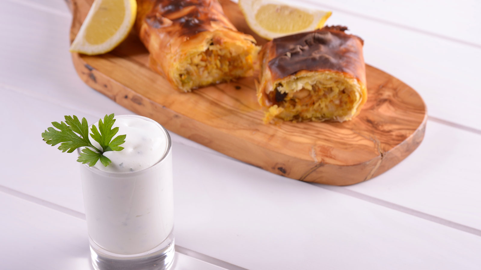 Pintamos con aceite de oliva tres o cuatro hojas de masa filo, ponemos el relleno en un extremo y enrollamos.
